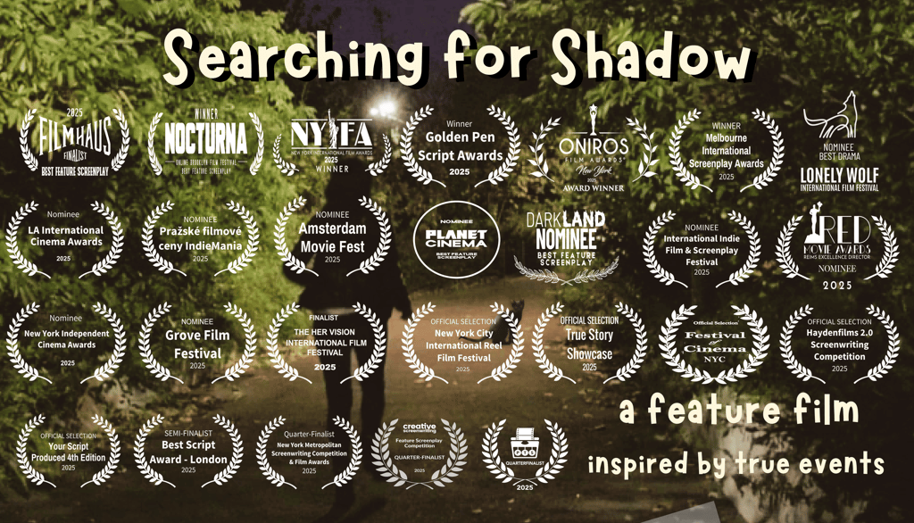My feature screenplay "Searching for Shadow" is the WINNER of the Golden Pen Script Awards, Oniros Film Awards, New York Independent Film Awards, Melbourne International Screenplay Awards, and Brooklyn's Nocturna Film Festival and a Nominee or Official Selection in festivals in NYC, LA, Paris, Berlin, Prague, Munich, and Amsterdam.